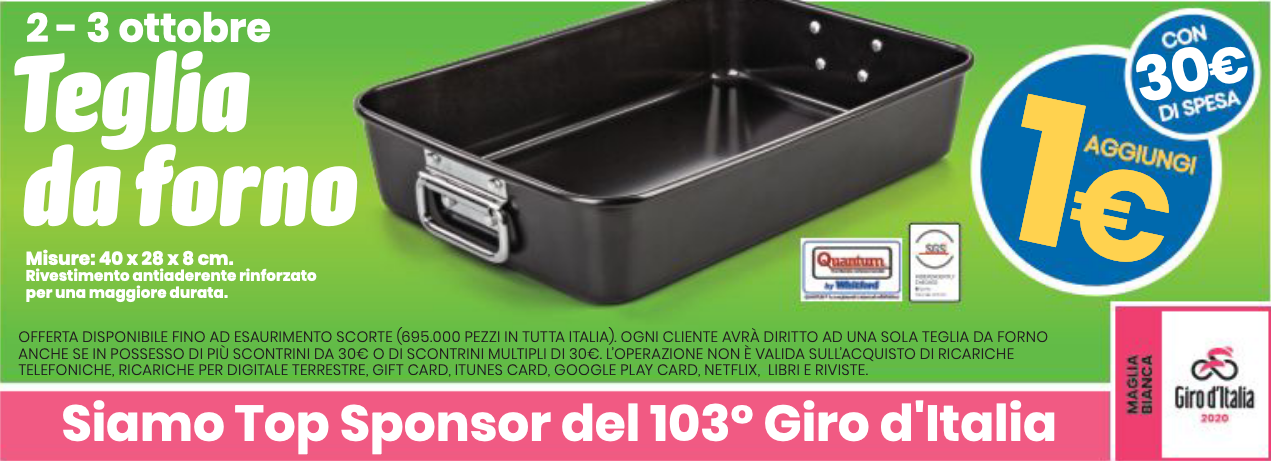 Nei Supermercati Eurospin nei giorni di venerdì e sabato 02 – 03 ottobre 2020 a fronte di una spesa minima di euro 30,00 con l’aggiunta di 1,00€ ricevi una teglia da forno con rivestimento antiaderente rinforzato.