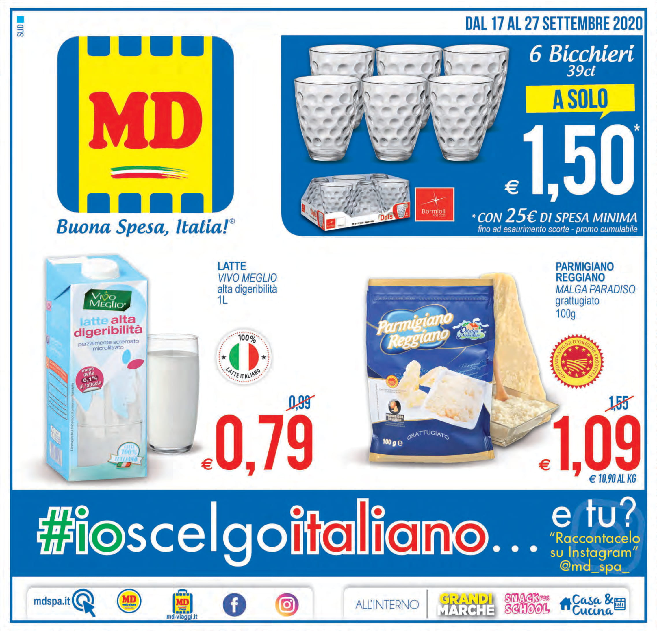 Nuovo volantino dei supermercati MD di Cosenza e provincia, valido dal 17 al 27 settembre 2020, con un minimo di spesa di 25 euro, aggiungendo 1,50€ ricevi subito un set di 6 bicchieri da 39cl.
